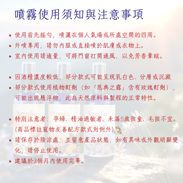 選定要使用的噴霧後,先閉上眼睛,透過呼吸與專注來沉澱自己的狀態,接著誠心講以下禱詞(以下禱詞為簡單示範,可以依自身情形來調整)